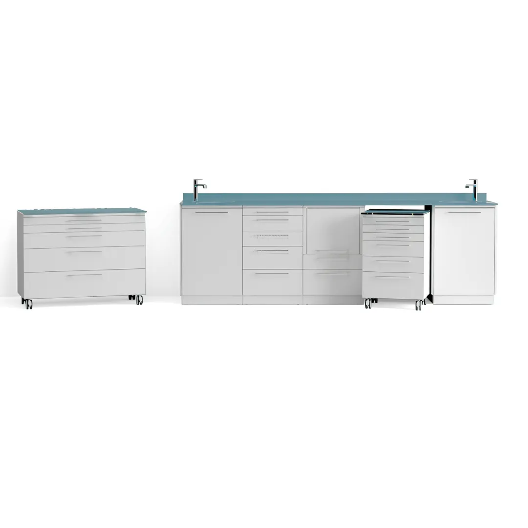 Klinik dolap sistemi, dental kliniklerde sterilizasyon, malzeme depolama ve çalışma alanlarının düzenlenmesi amacıyla tasarlanmış modüler bir donanım çözümüdür. Dental alanın gerektirdiği hijyen standartları ve kullanım kolaylığı göz önünde bulundurularak geliştirilen bu sistem, endodonti, protetik ve genel diş hekimliği uygulamalarında iş akışını optimize etmeye yönelik işlevsellik sunar. Klinik dolap sistemi, dayanıklı malzeme yapısı ve ergonomik tasarımı sayesinde uzun süreli kullanımlarda biyo-uyumluluk ve temizlik standartlarına uygunluk sağlar.
